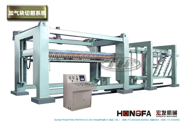 工作原理:翻转吊具把模具带坯体一起空中翻转90度置切割小车上,脱模把坯体连同侧板留在切割小车上,切割小车由电机作动力行走,通过纵切装置完成纵向切割、铣槽、水平切割;切割小车继续行走至横切装置中央位置停止后,横切装置启动,横切架自上而下垂直下切完成横向切割;切割小车再行走至编组吊具处由编组吊具将坯体(连侧板)吊至蒸养小车上,切割小车返回原始位置进行下一个切割循环。