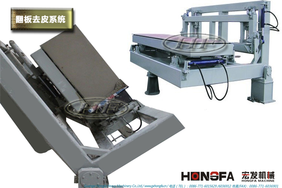 翻转吊具将坯体(带模具、侧板)在空中翻转90度,吊放置切割台或切割小车上,脱模进行切割。另外,将脱模下来的模框与返回的侧板进行组模,吊运至浇注回车线上进行循环浇注。